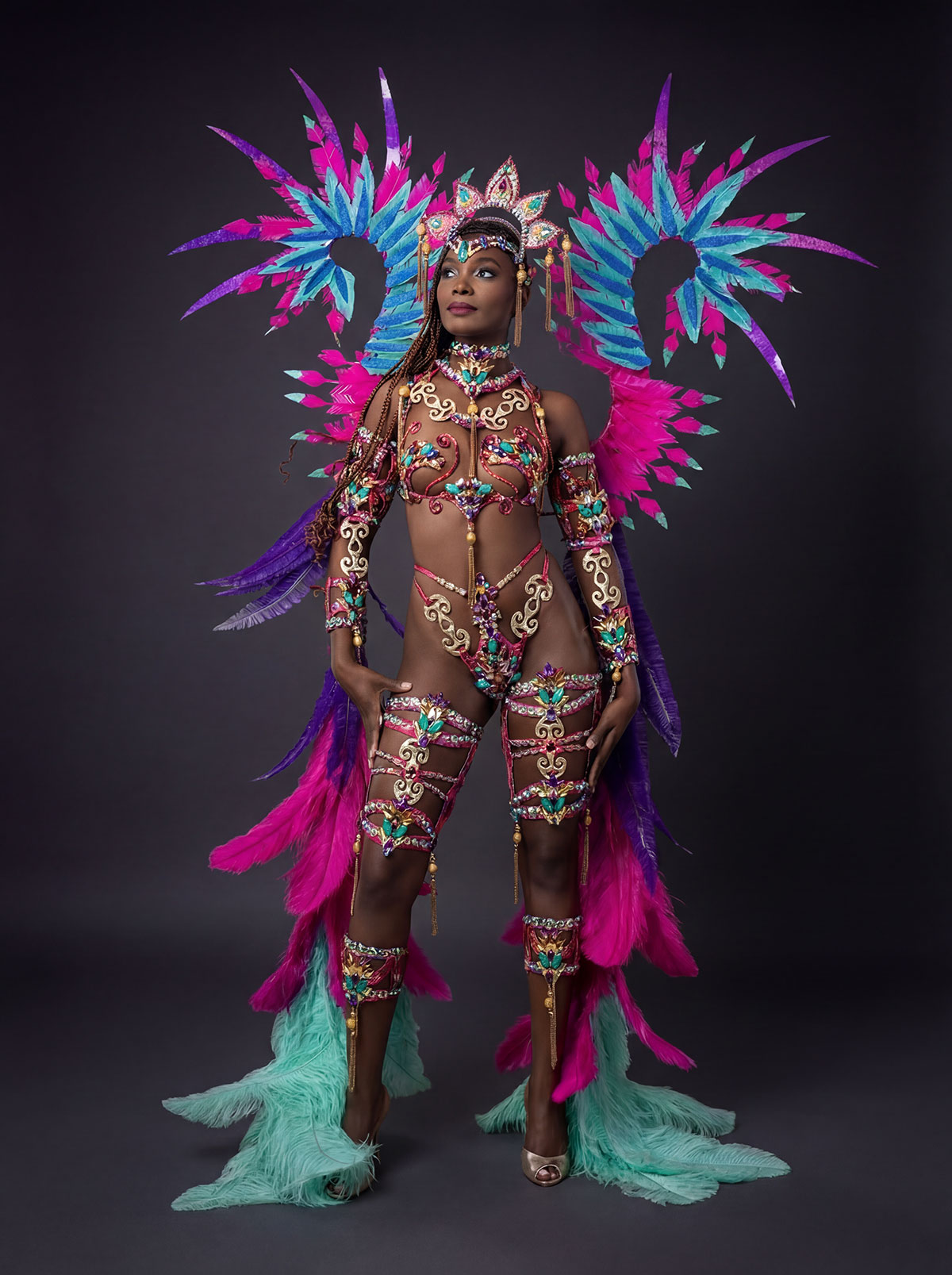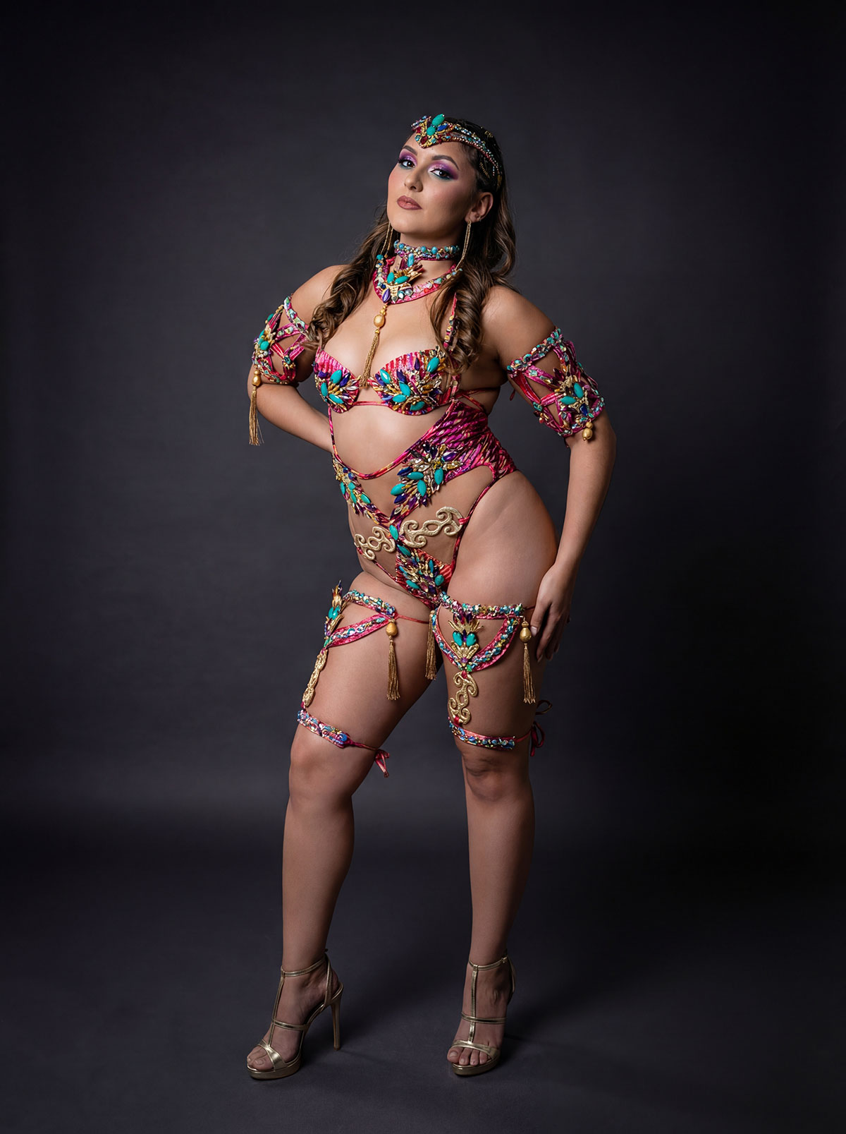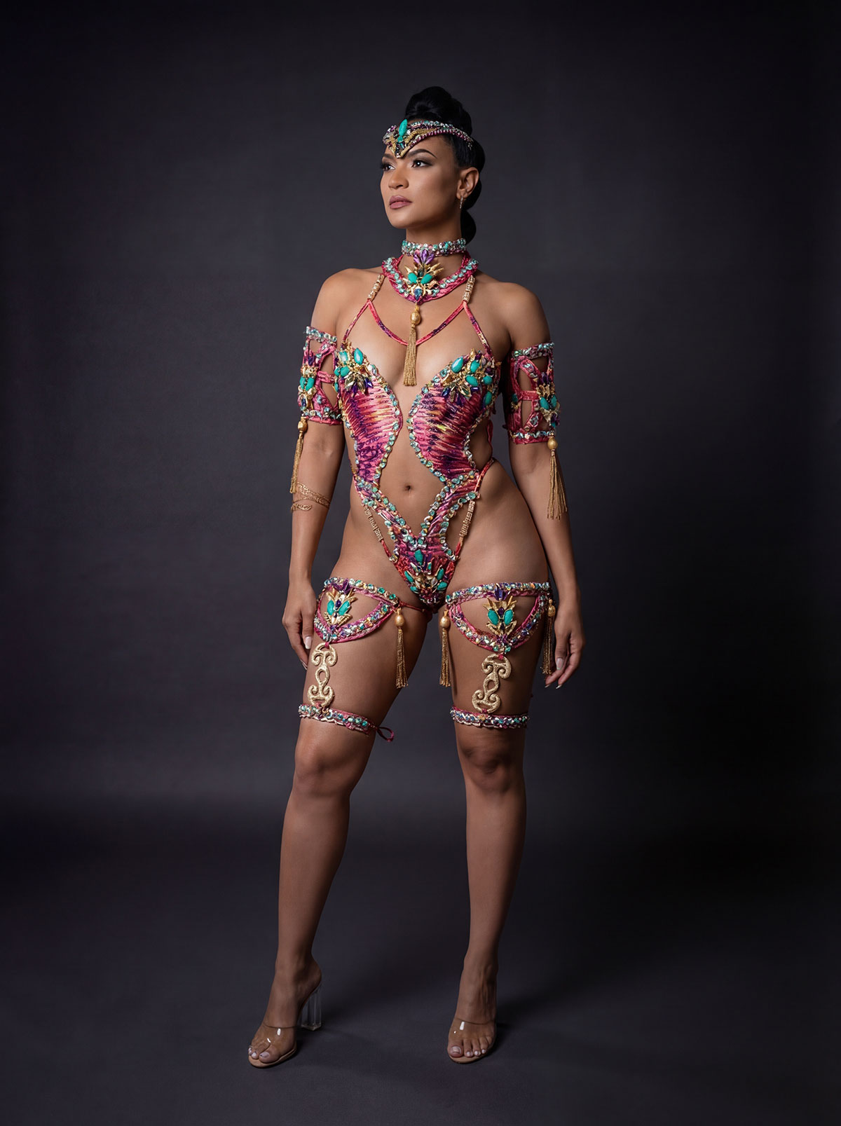 Large headpiece, large necklace, a pair of full arm pieces, a pair of lower arm pieces, a pair of large thigh pieces and a pair of calf pieces.